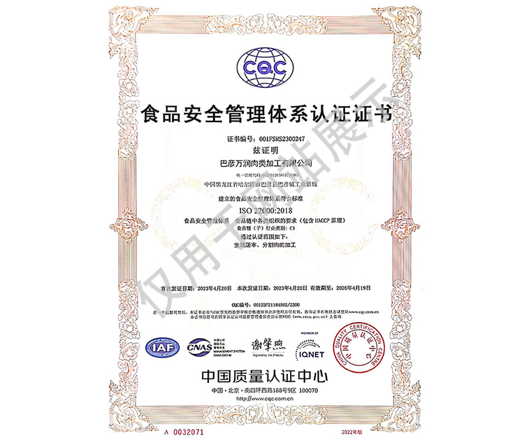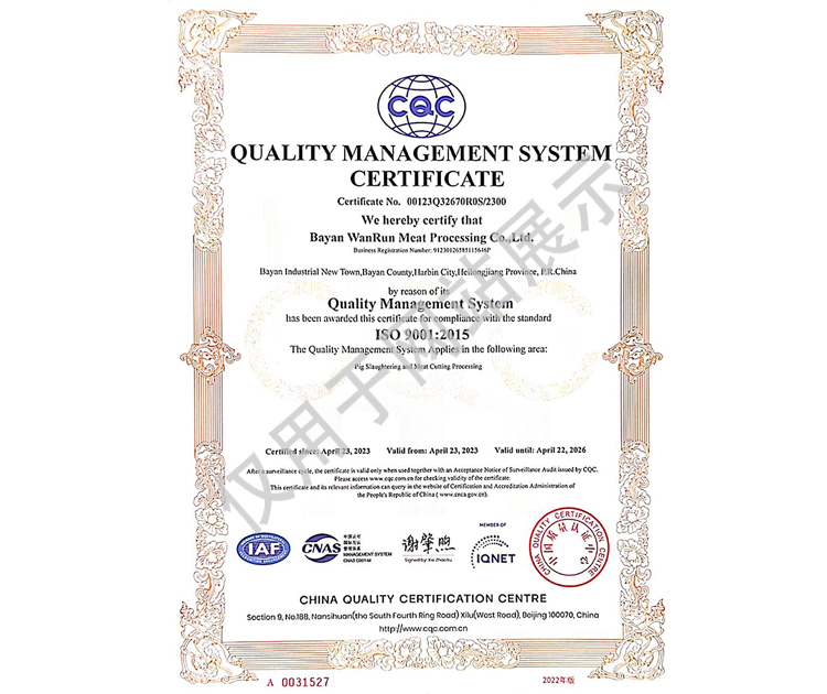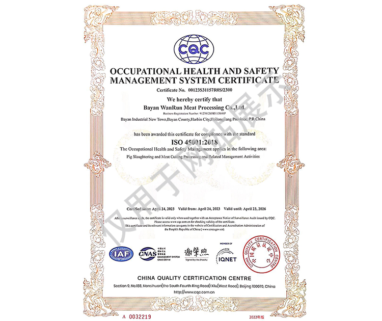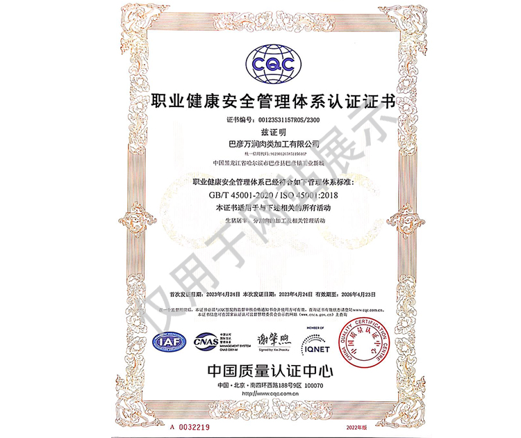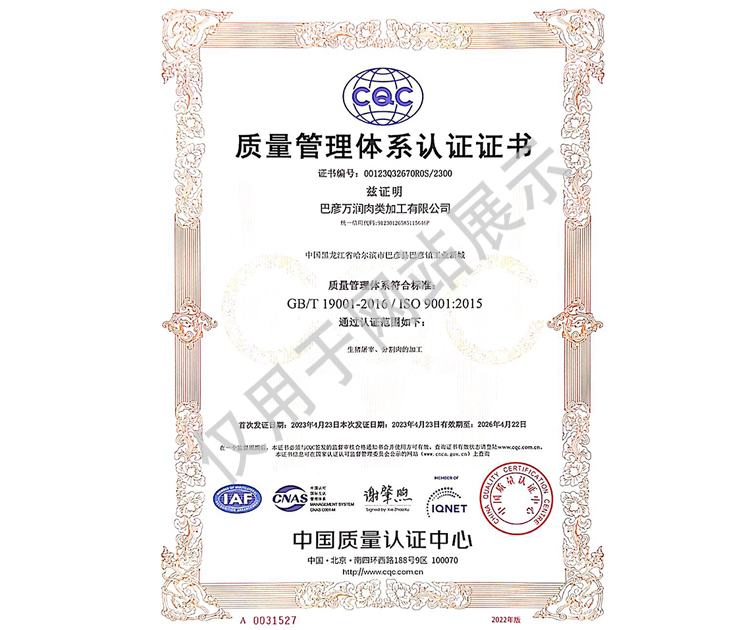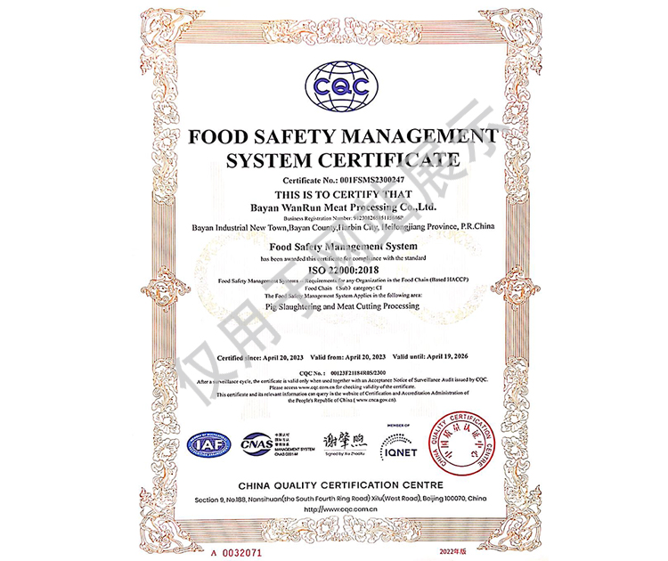 2016年公司通過了中國(guó)質(zhì)量認(rèn)證中心的質(zhì)量管理體系(ISO9001)和食品安全管理體系(ISO22000)認(rèn)證;2017年已取得國(guó)家進(jìn)出口企業(yè)認(rèn)證;是中國(guó)肉類協(xié)會(huì)會(huì)員單位,黑龍江省肉類協(xié)會(huì)副會(huì)長(zhǎng)單位;2017年,公司產(chǎn)品經(jīng)中國(guó)綠色食品發(fā)展中心審核,被認(rèn)定為綠色食品A級(jí)產(chǎn)品;被省畜牧獸醫(yī)局確定為全國(guó)生豬屠宰標(biāo)準(zhǔn)化創(chuàng)建示范企業(yè)(全國(guó)僅6家)。2018年12月,被評(píng)定為市級(jí)農(nóng)業(yè)產(chǎn)業(yè)化重點(diǎn)龍頭企業(yè)。2019年1月,被評(píng)定為省級(jí)農(nóng)業(yè)產(chǎn)業(yè)化龍頭企業(yè)。