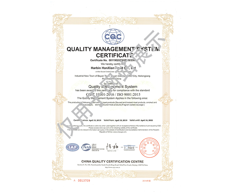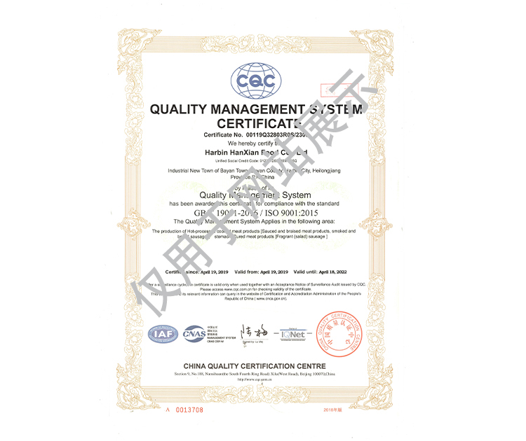 2016年公司通過了中國質(zhì)量認證中心的質(zhì)量管理體系(ISO9001)和食品安全管理體系(ISO22000)認證;2017年已取得國家進出口企業(yè)認證;是中國肉類協(xié)會會員單位,黑龍江省肉類協(xié)會副會長單位;2017年,公司產(chǎn)品經(jīng)中國綠色食品發(fā)展中心審核,被認定為綠色食品A級產(chǎn)品;被省畜牧獸醫(yī)局確定為全國生豬屠宰標準化創(chuàng)建示范企業(yè)(全國僅6家)。2018年12月,被評定為市級農(nóng)業(yè)產(chǎn)業(yè)化重點龍頭企業(yè)。2019年1月,被評定為省級農(nóng)業(yè)產(chǎn)業(yè)化龍頭企業(yè)。